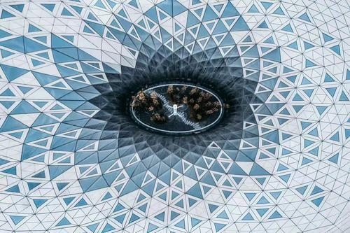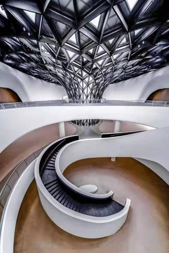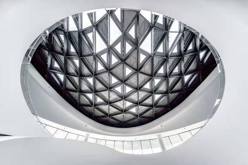 建筑主体网形钢材料组成的中央多曲面的流线“荷叶状”筒体结构串联起地面与屋顶,光线从钢材空隙间的玻璃洒向每层楼。这扇“巨型荷叶”采用由3000多根截面扁平宽度仅为8cm的箱体交汇相贯焊接组成,加工难度极大,为适应灵动造型,其中弯扭杆件多达2300多根,复杂汇交米字形节点多达700多根。