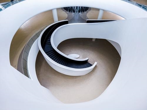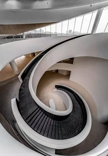 弯曲的不只是地面的线条,空间内部也被各种弯曲的线条有序划分。柔软的转角与盘旋的楼梯带给记者舒适的视觉体验。这些弯曲效果得以实现都是借助于异形GRG(石膏纤维制品)材料,它柔软的材质便于将各种造型独特的设计变为一件件实物。