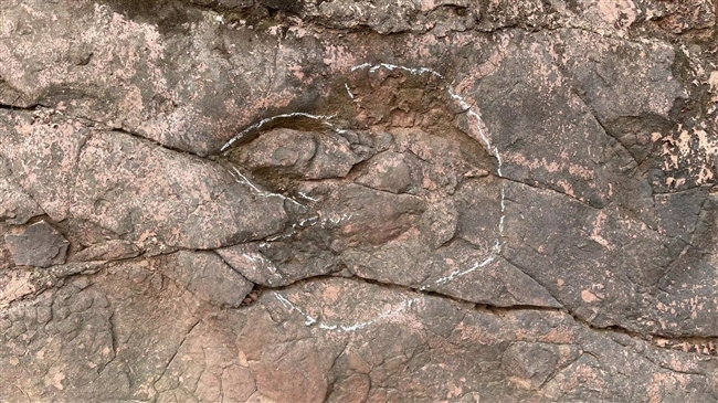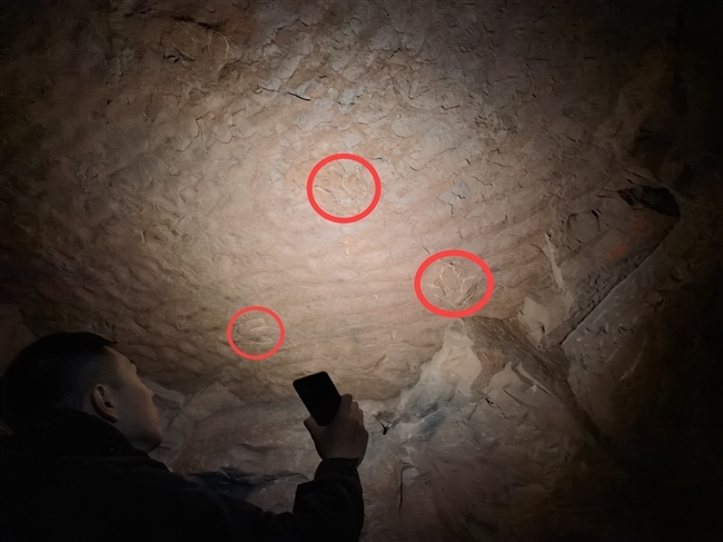 下午,考察人员一行来到了千佛岩景区内,在灵崖洞的洞顶上还发现了5个白垩纪恐龙足迹。