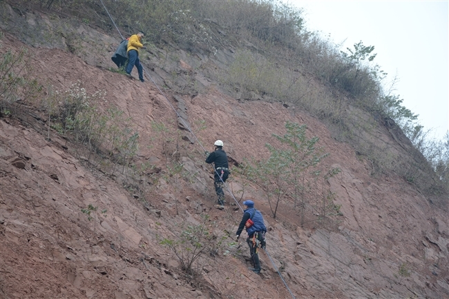“收到信息后,听说这里是在建工地,足迹有被破坏的可能,于是立即联系了自贡恐龙博物馆,来到现场进行抢救性考察。”邢立达在严宗米的指引下,穿戴好攀岩设备,拉着绳索沿着陡峭的坡面爬上了中间部位。