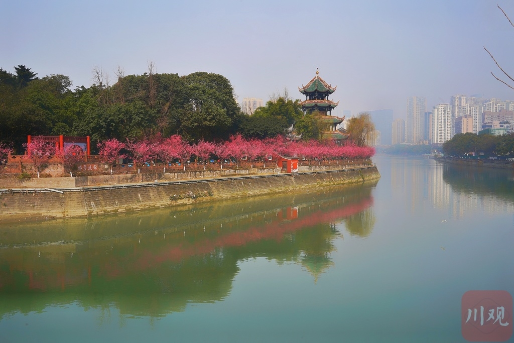 姹紫嫣红遍开望江沿岸,绿意盎然轻拂扬柳枝。2月9日,成都望江楼下红梅绽放,江水倒映出春意盎然的美景,新春时节,“原年人”赏花、观景正当时。