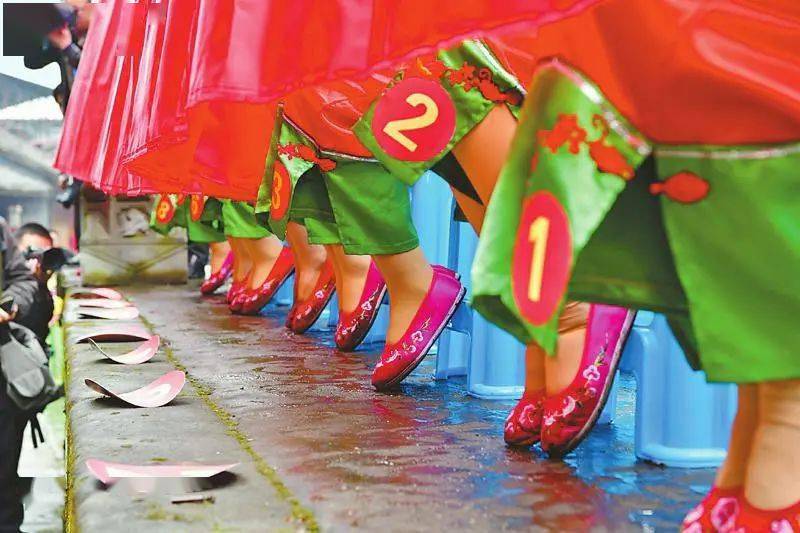 这一天终于来了,古街上人潮云集,上至耄耋老人,下至懵懂幼童。最是那春心萌动的少男少女们,伸长了脖子,眼巴巴等着司仪出场,只待“亮花鞋”活动的开始。活动开始前,早有专人沿街通知各家各户,俗称“号街”,告知比赛时间、比赛地点。比赛一般选择在正午,此时人最多,远的近的都来了;地点一般在老观镇新风街中段的那一个台子上,此处名曰“亮花台”。