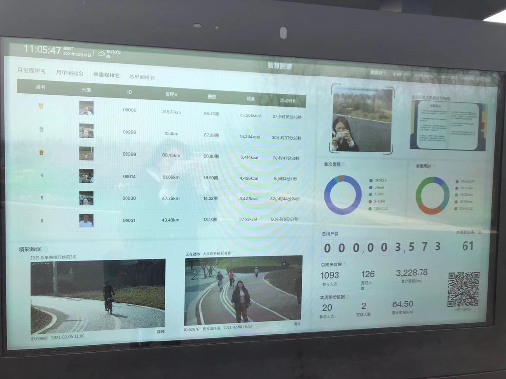 2月11日,在青龙湖二期全长3.3公里的环湖智慧跑道上,前来休闲健身的人们,正在享受一场锻炼与娱乐兼备的全新体验。这条沿湖蜿蜒盘踞的红色跑道上,只见不少市民正三三俩俩结伴跑步,而设置在湖边的一块电子屏幕上,此时正实时显示每个人的跑步里程、圈数、运动时长甚至还有消耗的卡路里。