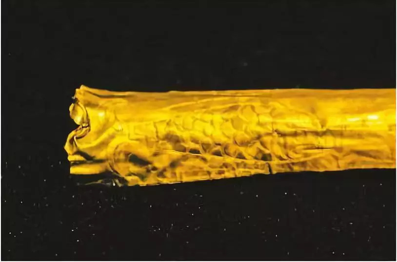 而最让大家惊喜的是,这根金杖的一端,平雕有46厘米长的三组图案:靠近端头的是两个前后对称的人头,他面带微笑,头戴五齿高冠;靠近杖的内部,雕刻了图案对称的鸟和鱼;鱼和鸟的颈部,各串着一根看似箭翎的图案。