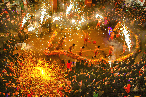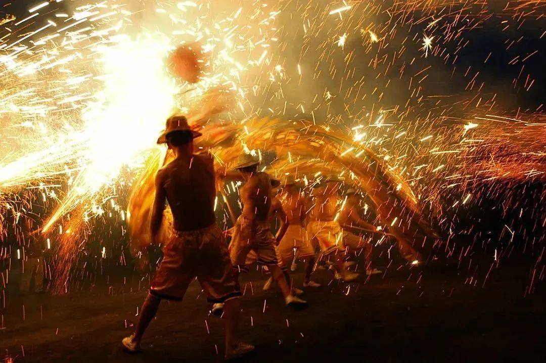 火龙舞的高潮部分是“烧火龙”。舞龙者赤裸上身,仅以桐油或清油涂抹胸背,腰下紧扎短裤,展现出惊人的勇气和毅力。而观众则手持焰花,向舞龙者喷射,形成了一幅火与龙交织的壮观画面。舞龙者与观众在火焰中你来我往,攻防进退,场面热烈而震撼。