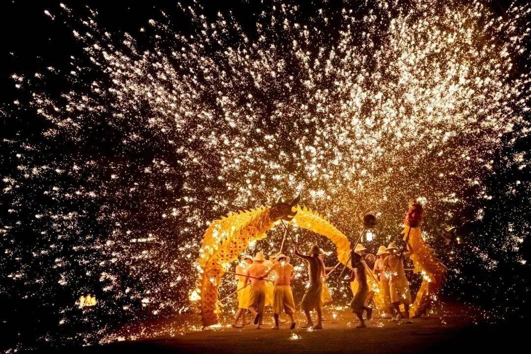 当铁水被炽热地加热至1600-1800摄氏度,仿佛熔岩般的烈焰在匠人们的精湛技艺下跃动。身怀绝技的传承者们,手中的铁勺与地面一碰即发,金花四溅,犹如繁星点点洒落人间,铺就一片璀璨的银河。在这万树铁花盛开的奇景之下,舞龙的人们头戴草帽,上身裸露,仅着短裤和草鞋,他们如同龙魂附体,穿梭于这热烈而浪漫的天地之间,每一次腾跃、每一次舞动,都仿佛在与星辰对话,场面震撼人心,美不胜收,宛如一幅壮丽绝伦的画卷在眼前徐徐展开。