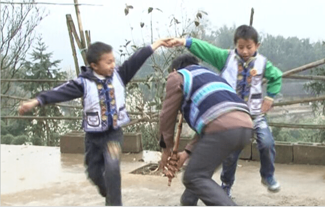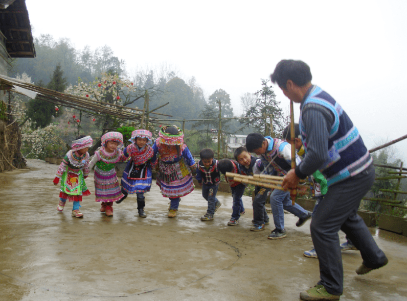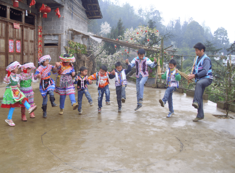 龙钻洞舞亦系模仿动物动作,亦为兴文苗族所独具。一人吹笙,二人随节起舞,见吹者将至,搭手成洞,吹者穿洞而过,或往左或往右转回,二人放手转身一圈肩头相碰,口喊“水捉”,如此循环往复。