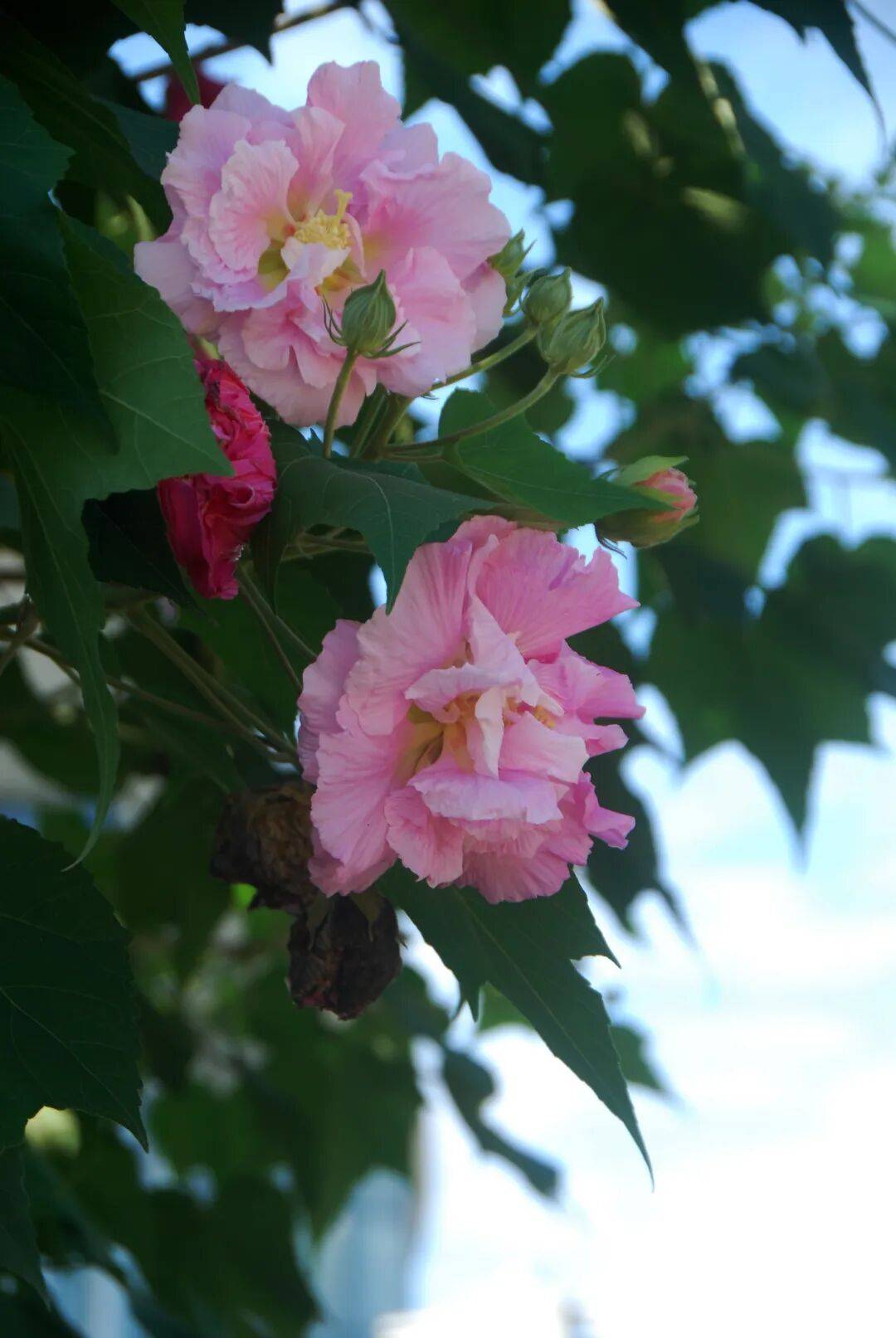芙蓉花有很强的地域属性,它实在是蜀地花中的曼妙仙子,高贵雅致。当花儿盛开的时候,天地冰清玉洁。那些阔大的叶片,便是它的裙裾;而那些或红或白的花朵,则是它粉嫩的脸庞。