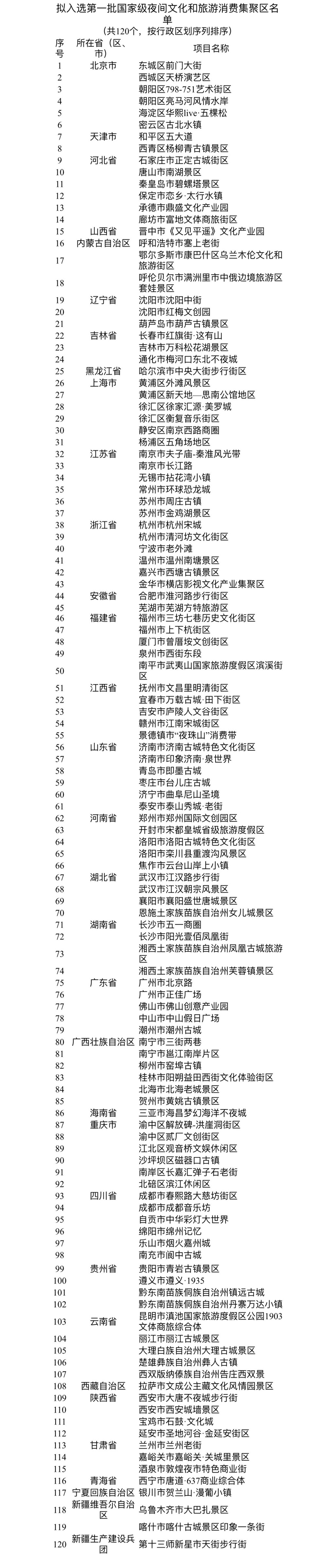 10月19日,记者从文化和旅游部官网获悉,根据《文化和旅游部办公厅关于开展第一批国家级夜间文化和旅游消费集聚区建设工作的通知》(办产业发〔2021〕123号),经地方申报、省厅推荐、合规性审查、专家评审、舆情风控、实地考察等方式,拟确定北京市东城区前门大街等120个项目为第一批国家级夜间文化和旅游消费集聚区,并对名单进行公示。