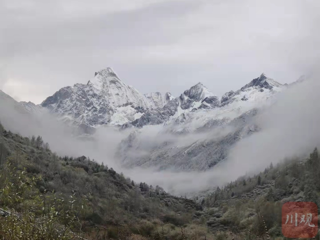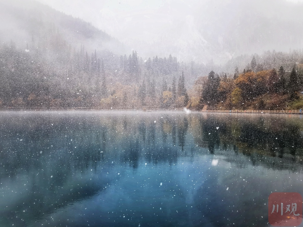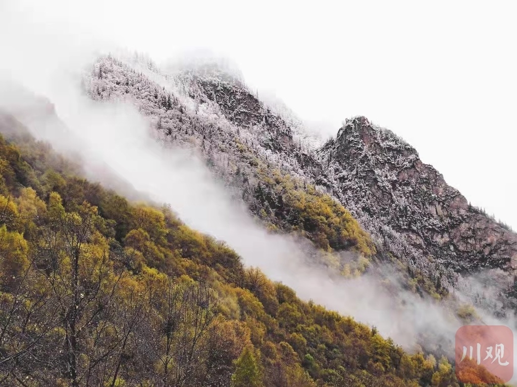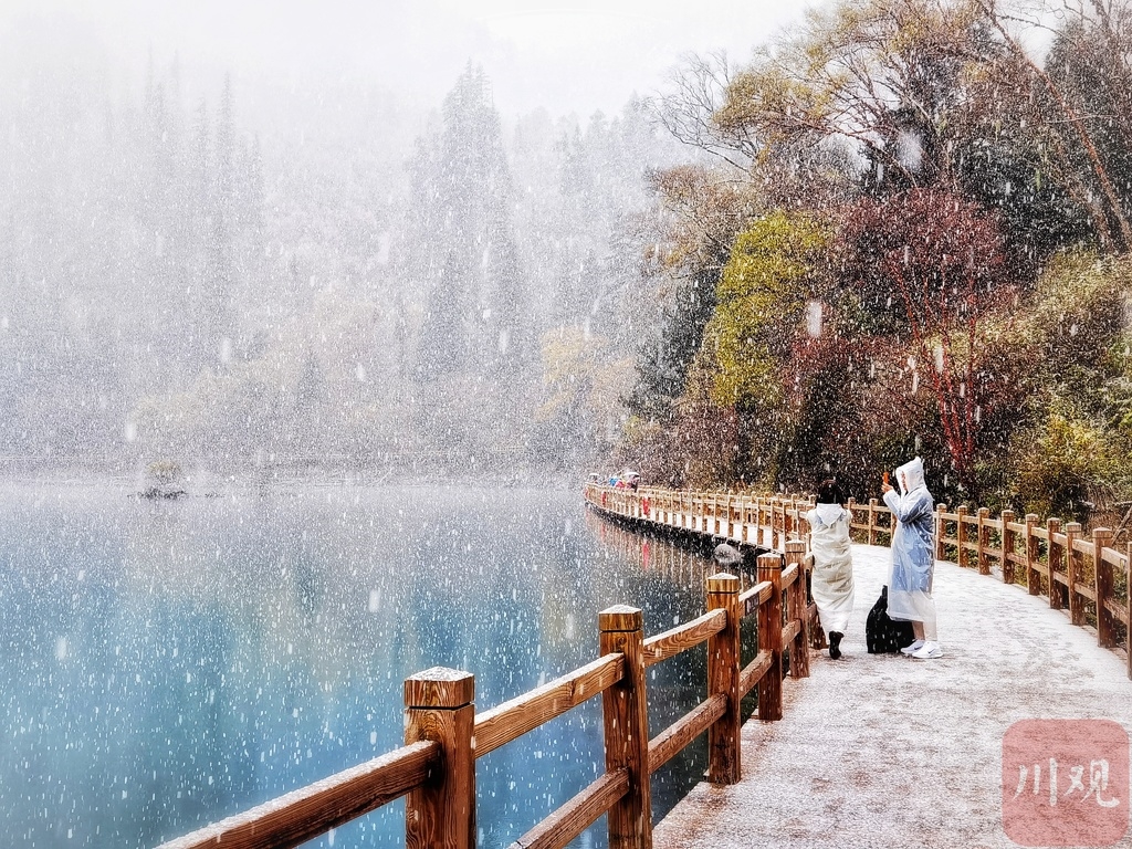 最近两三天,川西高原冷空气活动频繁,气温变化加剧。受此影响,阿坝州九寨沟、黄龙、四姑娘山、达古冰川等多个景区迎来降雪天气,雪山、彩林、海子,与纷纷扬扬的雪花相映成趣,宛如童话世界。