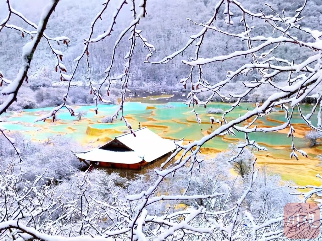 10月21日,黄龙景区开始降雪。22日一大早,纷纷扬扬的雪花让整个景区银装素裹,远处的山、近处的树,全是一片朦朦胧胧的洁白。彩池、古寺在雪花的映衬下,显得格外美丽和宁静。