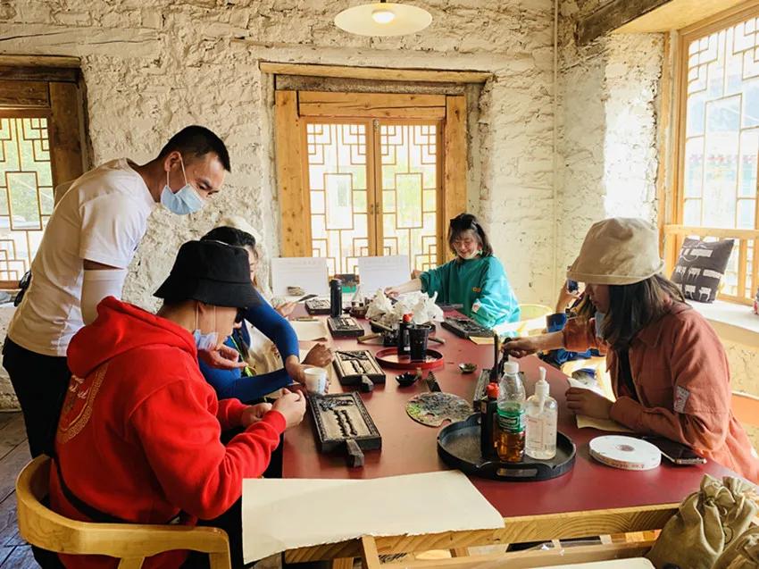 理塘仓央诗歌馆内,理塘县作家协会成员指导游客进行传统刻板印刷(图片来源:甘孜日报社)
