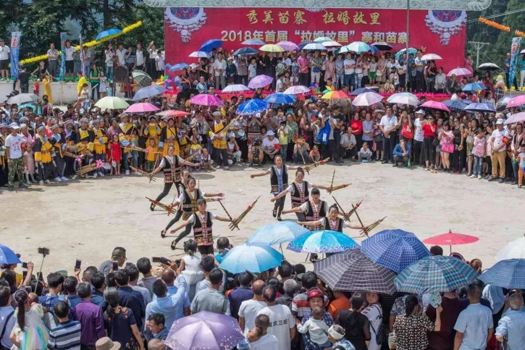 2018年8月12日(农历七月初二),在四川省叙永县麻城镇寨和村苗寨,2018年首届“拉婚故里”寨和苗寨苗场节隆重举行。激情如火的盛夏七月,我们从叙永县城驱车前往风光旖旎的“拉婚故里”麻城镇寨和苗寨,与苗族同胞一起欢度苗场节,采撷丰富多彩的“拉婚”苗族风情。“古韵悠悠舞芦笙,齐鸣管乐曲调新。未饮先醉拦门酒,盛满苗家一片情。”在寨和苗寨的寨门外,两侧身着盛装的苗族青年吹奏悦耳的芦笙,兴高采烈地迎接来宾;身着盛装的苗族姑娘高唱苗族敬酒歌,端起酒碗热情地向尊敬的客人献上“拦门酒”(苗家米酒)。苗族同胞热情好客,客人不喝三碗“拦门酒”就不能进入苗寨大门。