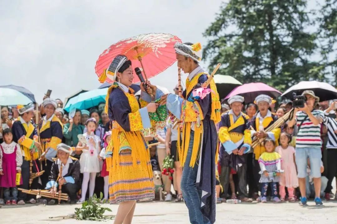 “拉婚故里”看拉婚,阿哥阿妹结良缘。川南叙永的苗族婚俗具有自由恋爱的特色,源远流长,历史悠久。青年男女在苗场节、踩花山等节日活动中自由选择对象,双方同意,即可结婚。苗族的婚姻,历史上多是自由自主。清末徐心余《蜀游闻见录》载:“苗人旧俗,凡遇婚丧,均以唱歌为酬应之具。汉人之谙习苗歌者,谓节奏铿锵,较汉音尤委婉动听。蔺俗以二五八为赶场期……凡苗家及婚之少年男女,均于是日齐集蔺场各自择配。如双方许可,身束之彩带,即取而交换之。带以彩线织成,花样繁多,各有记认,一经交换,永无改更。回家后男据情禀告家长,延媒向女家告婚,即可择期行礼。”清光绪三十四年(1908)《续修叙永永宁厅县合志·风俗》中也有苗族婚俗的记载:“每于正月初旬,椎牛酾酒,约会高阜,名曰踩山,夜聚曰跳月。未婚嫁者,男吹芦笙,女弹口琴,彼此对歌,相悦则引带为婚。”1935年版《叙永县志》卷四记载:“跳月者,苗人之婚礼也。每岁阴历正月初八聚,未婚男女于郊,跳月跳舞连袂,宛转以为节,情钟意合自相配偶,父母不禁。”可见,川南苗族自由恋爱的婚俗历史悠久。