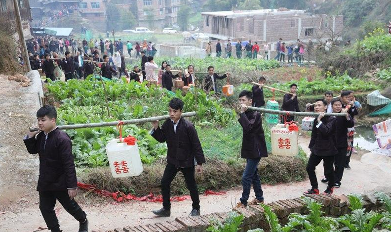 农人结婚有起媒酒和正酒各一天,加起来共二天。起媒酒在女方过,正酒在男方过。起媒酒那天,女方的亲戚都来祝贺。男方把彩礼千里迢迢送来,然后用桌子把聘礼摆好摆顺,给女方的乡里乡亲观看。来观看的多半是邻里长辈,同邻的女儿家和小孩子。彩礼多,则显示男方阔,女方也有面子。正酒那天,也就是起媒酒的第二天,新娘才跟着送亲的队伍到新娘家,往往是敲锣打鼓,很热闹。在送亲的队伍中,不可少的就是送亲客了。