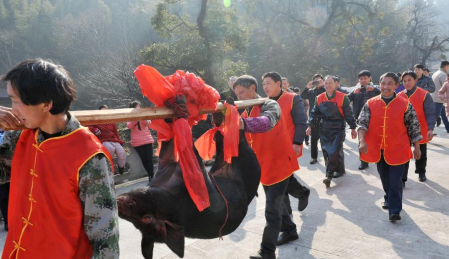 年末岁初,这山那坡,山上山下,几乎每天都能听到猪叫声,那是在杀年猪。杀年猪时,杀猪匠把猪从猪圈赶出来,几个壮汉一鼓作气把猪按倒在地,在下面垫上一块木板或石板,杀猪匠一刀杀进猪的喉咙,猪顷刻毙命。