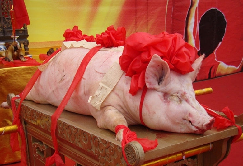 杀猪是很有讲究的,不论杀年猪还是平时杀猪,只能一刀毙命,不能杀几次,这样主人才能才运气旺,否则要倒霉。猪杀死后,杀猪匠再用挺杖穿过死猪的脉络,用口吹气,把猪吹得气鼓鼓的,像个大气球。再在地上挖个洞,上面再放上一口锅,用柴火把锅内的水烧熟。把熟水舀在死猪身上烫,用工具剃猪毛,直到把死猪剃得一丝不挂,白白净净。而后,再把猪用庖刀破开,取出内脏,放两根木凳,凳上放一个簸箕,把猪内脏按顺序放好,逐个清理。