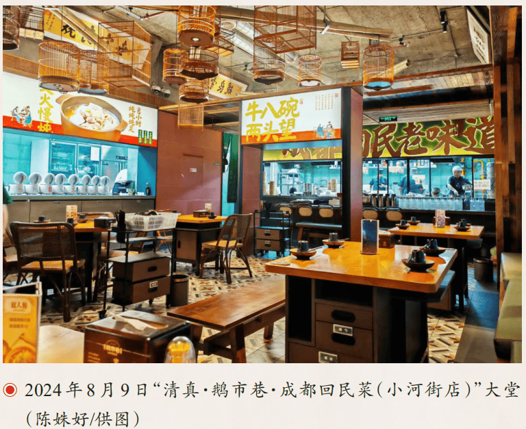 再者,店面装修风格的复古化与本土化是成都回族餐饮广受欢迎的一个重要原因。都市人群对就餐环境有相当的要求,饭店是否能获得食客广泛认同除菜品内容、质量外,饭店装设也是其中一项比较重要的参考标准。与西北地区回族餐厅相比,成都回族餐厅在装修风格上十分巧妙地融入了成都的历史和民俗。“鹅市巷·成都回民菜”为更好地融入成都现代餐饮业,吸引更广泛、更多元的客户群体,店面采用了新中式的装修风格,巧妙地将复古元素与现代设计相结合。悬挂鸟笼、摆放竹子,以及老式竹椅等细节,不仅营造出了老成都的怀旧氛围,也体现了对传统文化的尊重和传承。同时,现代的配色方案和宽敞的店面布局,为顾客提供了一个干净整洁、符合现代审美的就餐环境,成功打造了一家具有网红潜质的饭店。松潘牛肉馆、苏记穆罕餐馆以及遍布街头巷尾的回族面食馆,其店面风格都十分自然地融入成都的民俗生活中。