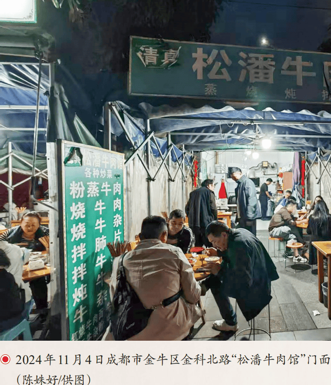 位于成都市西门老成灌路旁的土桥,历史上是成都西出前往松潘关外的第二驿站,有不少从事商贾贸易的回族在此定居生活。据20世纪90年代统计数据,土桥场镇回族人口约占总人口的40%。时至今日,这一带仍保留有不少回族餐厅。2024年11月4日晚,笔者实地调查走访了“松潘牛肉馆”。据老板介绍,店内主打“蒸、烧、炖、拌”,尤其以“烧”最受消费者喜爱。笔者问到口味,老板介绍说“主要是川味,以麻和辣为主”;问到人流量,老板答复说“中午时人比较多,食客主要是来自附近居住、工作的各族群众”。可见,“松潘牛肉馆”背后有着浓郁的历史和区位因素,并与其他民族互嵌互融共同生活于本地社区中。