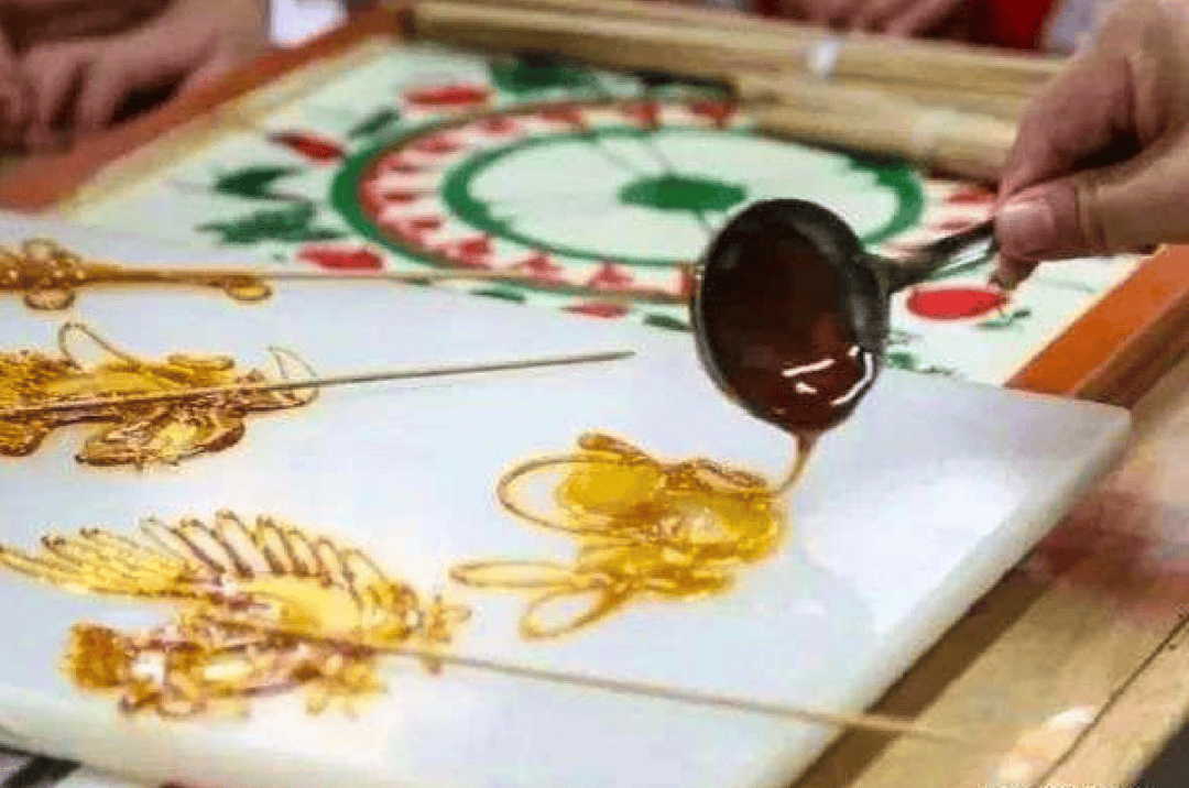 糖画以糖为材,造型精巧。传统制法需用黄糖(甘蔗糖与麦芽糖混合熬制),因火候难控,成品色泽偏暗;如今改用麦芽糖加冰糖,以液化气控温,糖汁金黄透亮,还可添加食用色素增艳。熬糖需掌握“快、准、匀”三诀:糖汁过热则焦,过凉则凝,艺人须眼明手快,运勺如飞,方能成就线条流畅、形神兼备的作品。题材上,除传统的武将、花鸟、瑞兽外,现代糖画亦融入飞机、汽车等元素,兼具平面与立体造型,全凭艺人的巧思与功底。