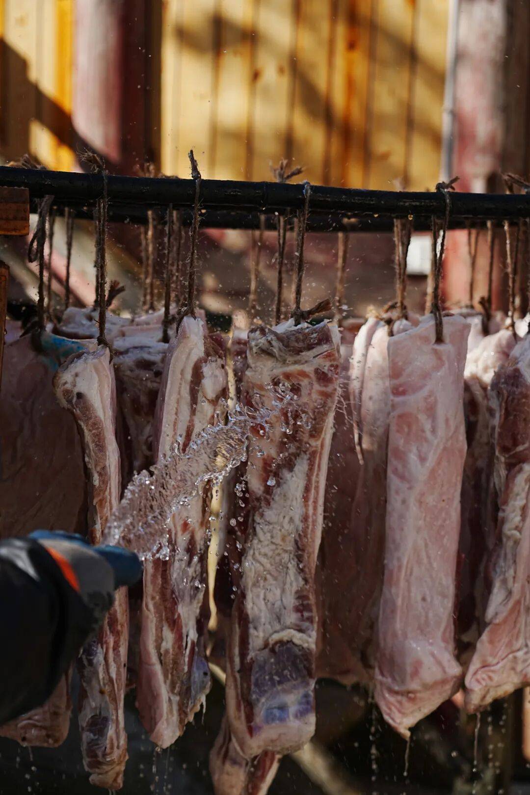 腌足七天的肉,出缸洗净,挂上晾架。“就放在院子里,晒上六七天,好的话四五天也行。”谢德勇说,这个阶段靠的是清平独特的山间气候——白日阳光温暖,夜晚山风凛冽,巨大的昼夜温差,让肉质在反复地“呼吸”中收紧,脂肪慢慢转化,吸纳着“日月之精华”。