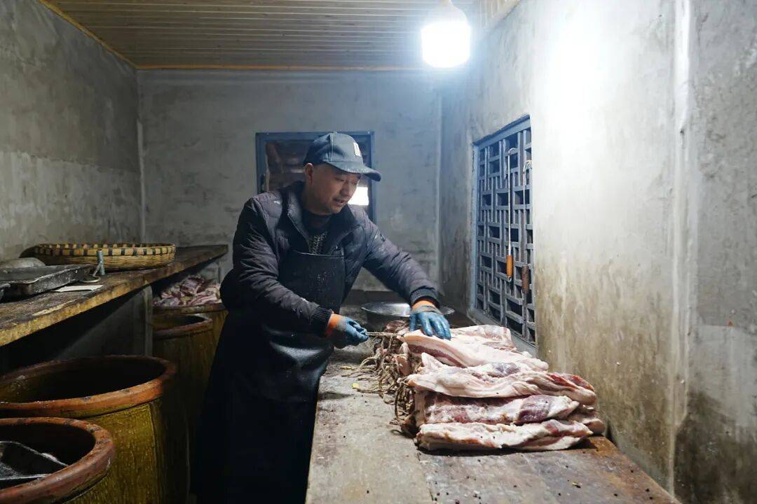 每年入冬后,精选的猪肉被运至作坊。谢德勇将其分割成条,便开始炒盐。大铁锅里,井盐与花椒、老姜片一同翻炒,香气被火热逼出,渗入每一粒盐中。炒好的盐,需趁热均匀地揉搓在肉条每一寸表面,“抹盐要透,要匀,力道得有,像给它按摩。”随后,肉被层层码入祖传的大瓦缸中,进行为期七天的腌制。