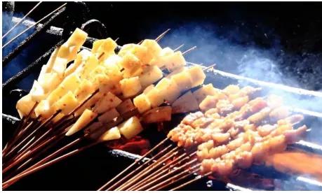 串串烧烤,大到餐馆,小到路边摊,皆可买到。夜幕降临,不管男女老少,都会上街撸两把,尝尝石棉烧烤的味道。