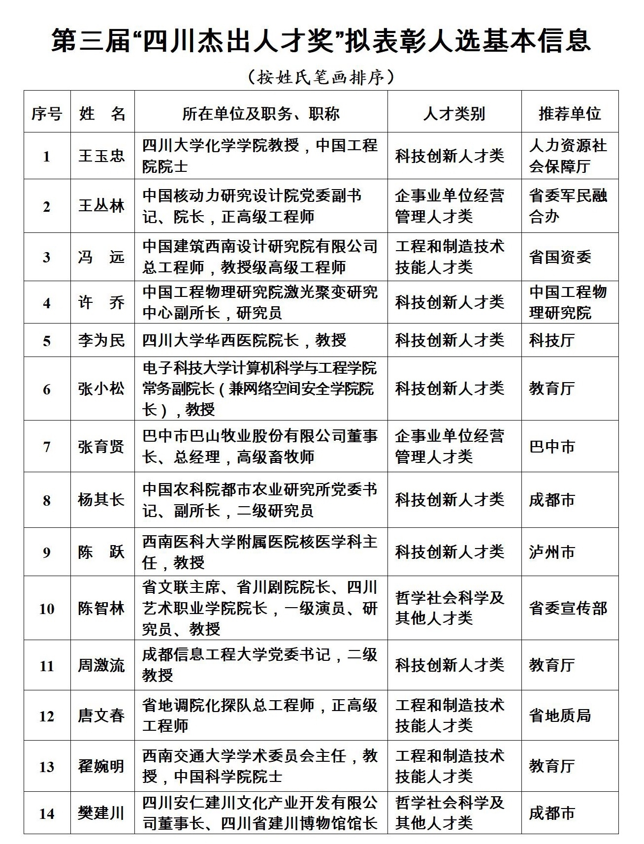 12月7日,省委人才办发布第三届“四川杰出人才奖”拟表彰人选公示,王玉忠等14名同志确定为第三届“四川杰出人才奖”拟表彰人选。具体如下。