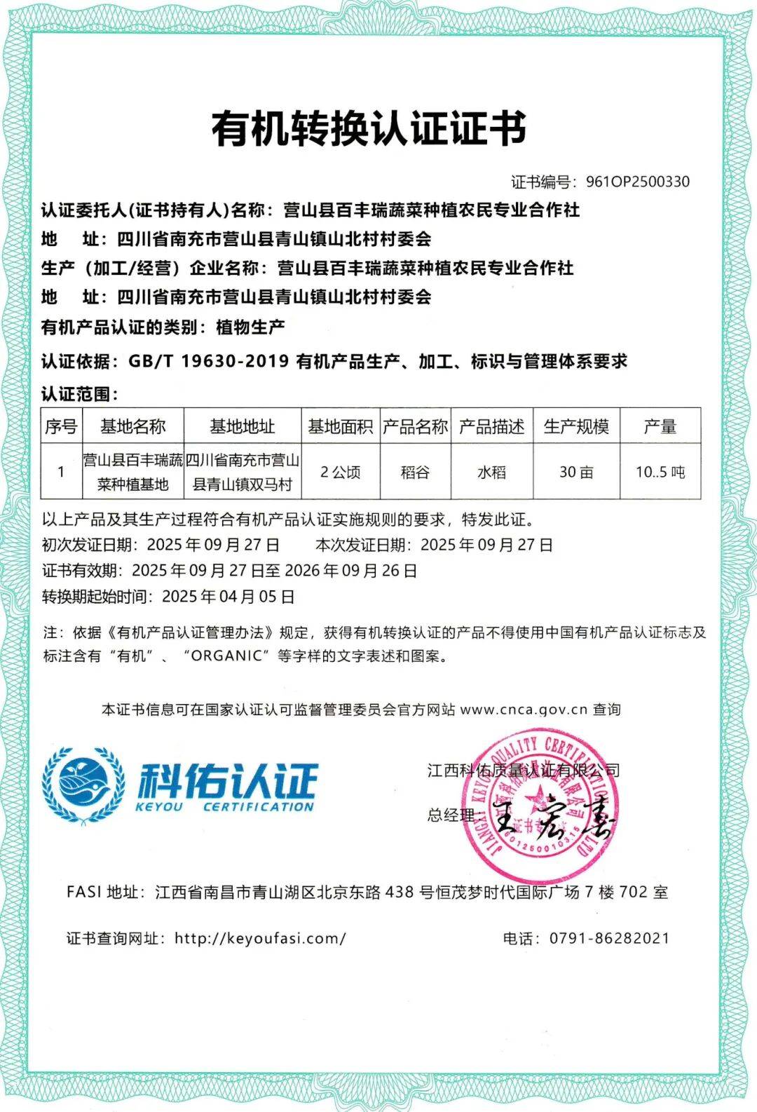 2025年6月,他的大米被北京A盛凡lSO认证为有机大米;同年8月,获得江西科佑公司有机大米认证证书。