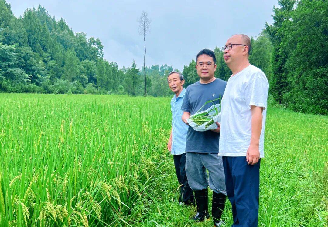 营山县农业局质检办干部何天伟(右一)、江西科佑公司有机大米认证师熊勇(中)和肖开勇在观察稻田长势(肖淋予 摄)