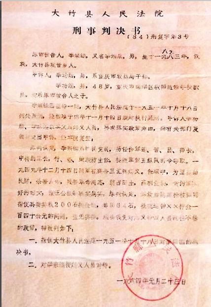 1984年1月23日,大竹县人民法院撤销1951年10月18日对李宗铿(鉴)的判决书,按起义人员对待。从此,被冤屈而死的抗日将领李宗铿(鉴)得到正义伸张。1985年6月4日,中国人民解放军成都军区给李宗铿(鉴)颁发了《起义人员证书》。