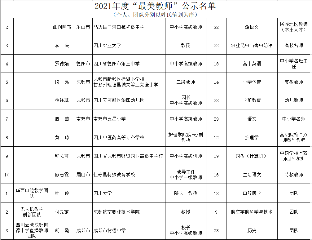 四川2021年度“最美教师”拟表扬个人(团队)名单公示