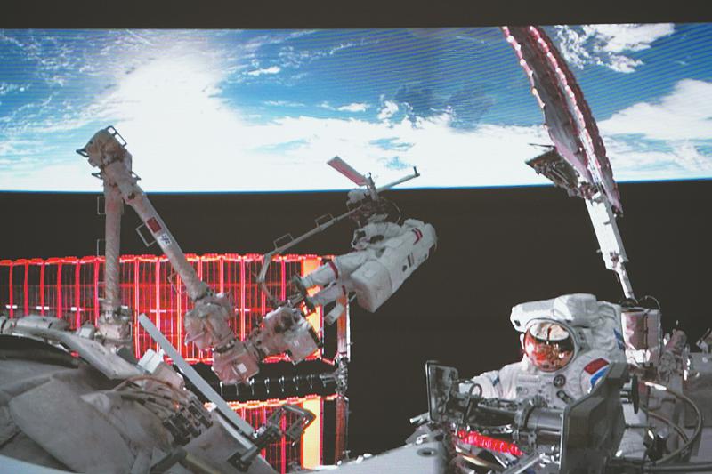 神舟二十一号乘组航天员张陆与武飞(右)在舱外工作。 新华社记者 刘艺 摄