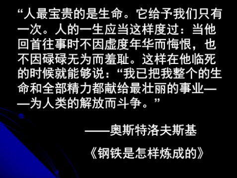 人为什么而活着?保尔·柯察金给予了最精辟的概括:“人最宝贵的是生命,生命属于人只有一次。一个人的生命是应该这样度过的,当他回首往事的时候,他不会因为虚度年华而悔恨,也不会因为碌碌无为而羞耻;这样,在临死的时候,他就能说我整个的生命和全部的精力,都已献给了人类最伟大的事业——为人类的解放而斗争。”
