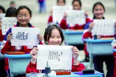 四川阆中的小学生体验传统印刷技艺在宣纸上印出来古诗。光明图片/视觉中国