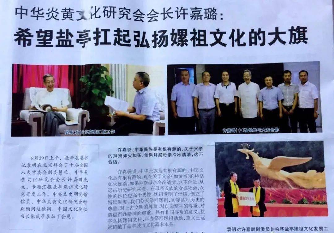 2016年8月29日上午,盐亭县委书记袁明在北京拜会十届全国人大常委会副委员长、中华炎黄文化研究会会长许嘉璐,专题汇报盐亭嫘祖文化研究开发工作。中央文史研究馆馆员、中华炎黄文化研究会特别顾问赵德润,中国文化院秘书长张武等参加了会见。在详细听取了袁明的汇报后,许嘉璐指出,巴蜀文化是丝绸文明的起源,盐亭是嫘祖故里和丝绸发源地。