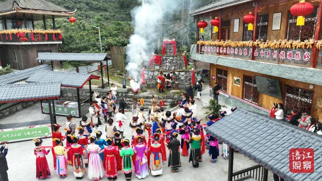 庆祝活动大体由祭祀和娱乐两部分组成。先由寨中德高望重的老人主持宰杀牛羊祭天神,焚烧纸做的猛兽,驱除邪恶;继而由4名壮汉抬着天神的象征—白石,众人随同遍游全寨;接着男女老少在草坪上围成一个个圆圈,载歌载舞,俗称跳喜庆萨朗。其间,穿插饮咂酒、馈赠所带美食享用、互贺新年等活动,狂欢到深夜方尽兴而散。