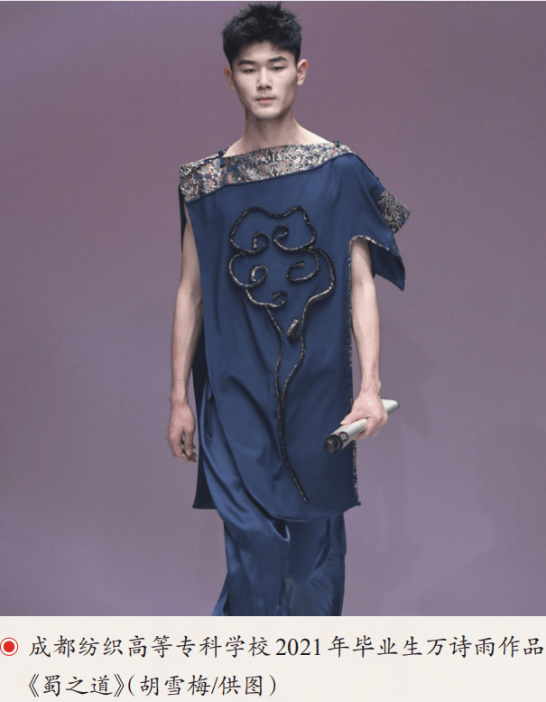 “器以辨等”思想不仅体现在工艺上,更体现在元素的文化意涵上,即元素的“身份感”。近年来,成都纺织高等专科学校紧密依托儒家文化与蜀文化,指导学生进行毕业创作。例如,自2021年举办的《蜀之道,以观复;蜀之道,以智变》毕业作品专场发布会,至2024年服装工程与设计学院举办的以《融创·新质蜀韵》为主题的优秀毕业设计作品专场秀,均巧妙地将蕴含儒家思想内涵的元素,如竹子、仙鹤、祥云等,与三星堆文化以及蜀锦、蜀绣等川派元素融合,创新性地应用于服装设计之中。在这些设计中,黑色这一高贵的色彩被广泛运用,可以说古代服饰的政治象征为现代设计提供了文化原型,实现了具体的“物化”。