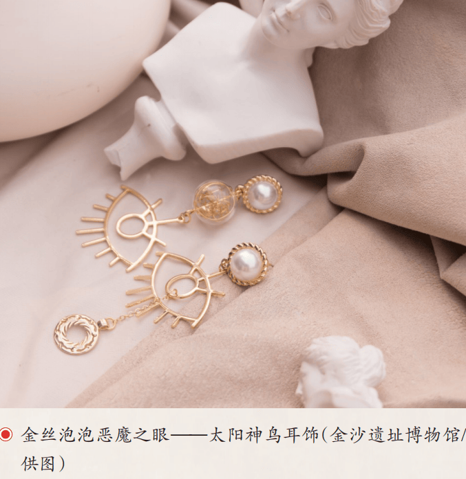 具体在儒学相关绘画图像的挖掘方面,设计师们将这些图像转化为实体产品,既保留了视觉上的原始还原,也融入了设计师个人的创意想象。例如,金沙遗址博物馆推出的太阳神鸟吊坠,其创意来源于金沙遗址博物馆的太阳神鸟金饰。该图案设计巧妙地与《尚书·尧典》中的记载呼应:“历象日月星辰,敬授人时……日中星鸟,以殷仲春。”这一理念源自儒家对于天地自然的敬畏之心。在古代农耕社会,天象变化直接影响着人们的生产生活,成为指导人们行为的重要原则。《山海经·大荒东经》中亦有记录:“汤谷上有扶木,一日方至,一日方出,皆载于乌。”这也是古人对太阳崇拜的一种体现。在该产品设计中,12道光对应12个月,寓意光明与永恒。四鸟逆时针飞翔的动态设计,将儒家敬畏自然秩序春、夏、秋、冬四季以及东、南、西、北四个方位转化为视觉符号,寓意自然规律的循环往复。四鸟环绕太阳,蕴含着自由与团结共处的深意,体现出儒家“和”的思想内涵。“和”是宇宙万物运行的基本法则,太阳神鸟吊坠的设计,正是将这种深刻的哲学思想融入了文创产品之中,使其不仅具有观赏价值,更富有文化内涵和教育意义。通过这一设计,人们能够更加直观地感受到儒家文化的魅力,从而加深对这一古老而深邃的哲学命题的理解和认同。此外,金沙双耳杯的设计灵感源自金沙遗址出土的蛙形金箔,该金器造型独特,仅见于金沙遗址。基于蛙形器,设计师们进行了创新性的衍生设计,运用数条金色线条勾勒出抽象的形态,既展现了抽象艺术的风格,又呈现出独特的外观和精致的纹饰,象征着持续的好运。蛙作为生殖崇拜的符号,与儒家所倡导的“多子多福”生育理念相一致。金沙遗址博物馆精心推出的“望月”系列首饰,巧妙地将古蜀先民对月亮的深厚崇拜和无限向往以及儒家对女性的美好期待相融合,通过现代设计手法转化为独具特色的时尚装饰品。
