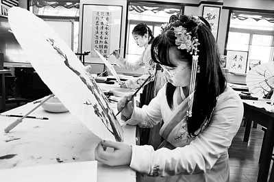 沈阳市沈河区朝阳一校学生学习画与“雨水”节气相关的花伞。赵敬东摄/光明图片
