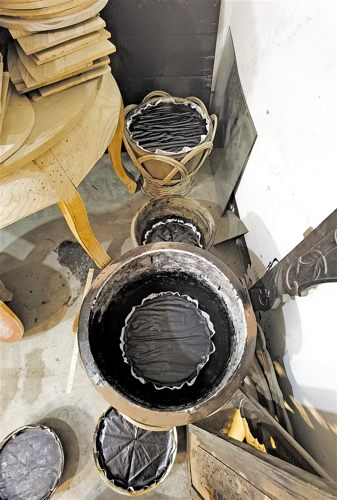 割取的漆液须经过过滤、搅拌、脱水等多道工序,才能制成精制生漆和熟漆,过程艰辛。而多数人在接触未干的生漆时都会有不同程度的过敏,需要蜕一层皮才会好转。此外,生漆的干燥,还需要一个适宜的荫干环境,“生漆可比人有脾气多了,太阳暴晒、气候寒冷都不易干燥,而只要一层漆未干就不能进行下一道工序。”精益求精的吕世林并未因为笔者的到来展示生漆器物的制作,“你今天来的时间不巧,我们这一批八仙桌的刮灰是在一周前,现在还未干透,不能为你演示下一道工序。”