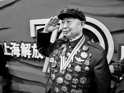 2019年5月,在“庆祝上海解放70周年主题拍摄活动”启动仪式上,亲历解放战争的老兵向大家敬礼。李宝洋摄/光明图片