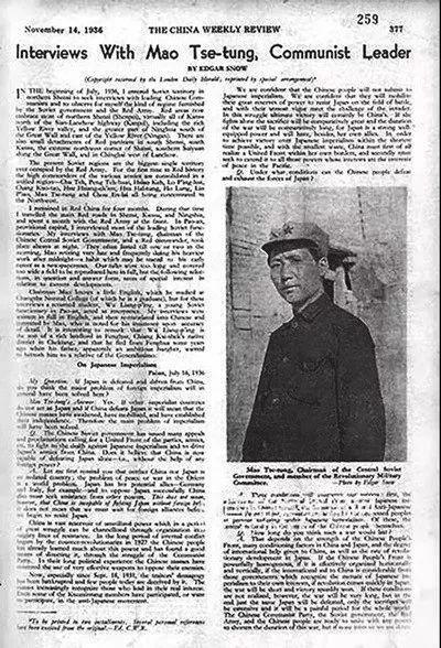 斯诺采访毛泽东的长文刊发在 1936 年11 月 14 日的《密勒氏评论报》上