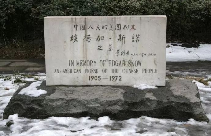 北京大学未名湖南岸斯诺墓。1973年10月,遵其遗嘱部分骨灰安葬在北大未名湖畔(图片来自网络)