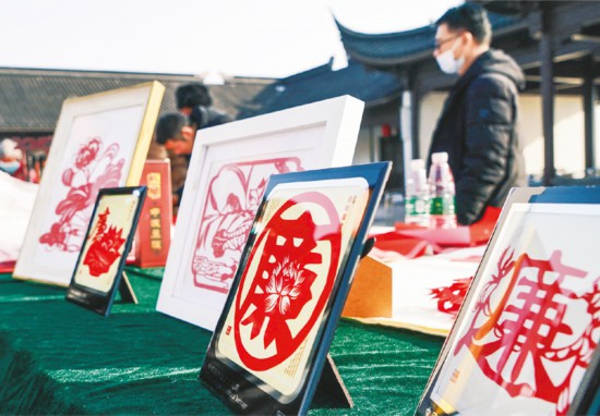 2021年1月14日,江苏省连云港市灌云县纪委监委在当地同兴镇梅园文化广场举行廉政文化进乡村活动。图为在活动现场拍摄的廉政主题剪纸。 新华社记者 李博/摄