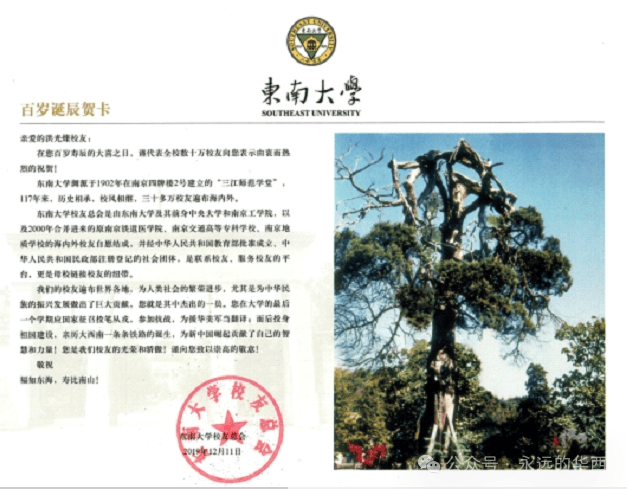 艺术学院副教授张志贤博士为洪光煃学长专门设计了一组独一无二的,包含了校徽、大礼堂、六朝松、老图书馆和老南门等东大元素的百岁生日贺卡。