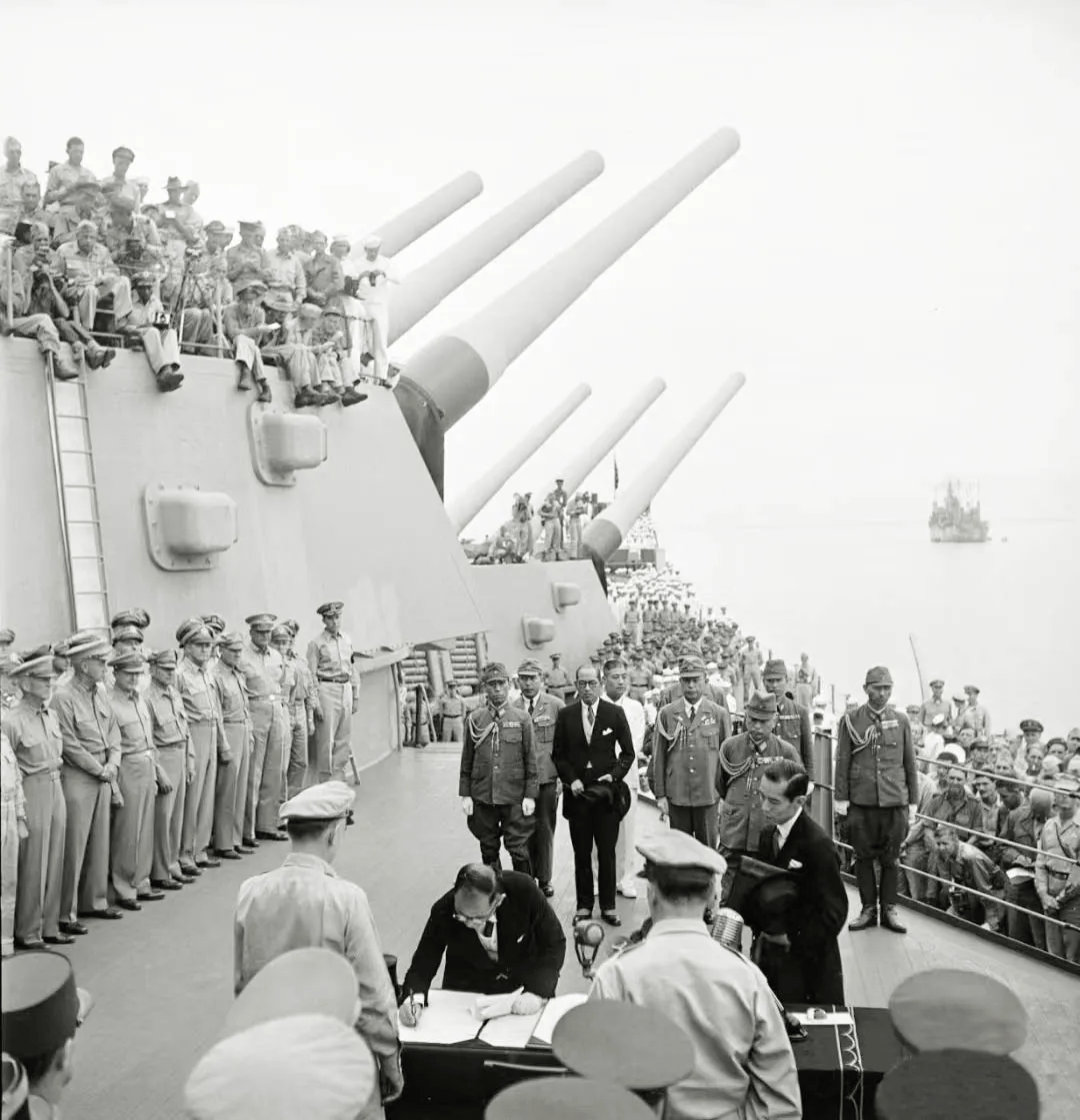 1945年9月2日,日本代表在东京湾美国“密苏里”号战列舰上签署投降书。