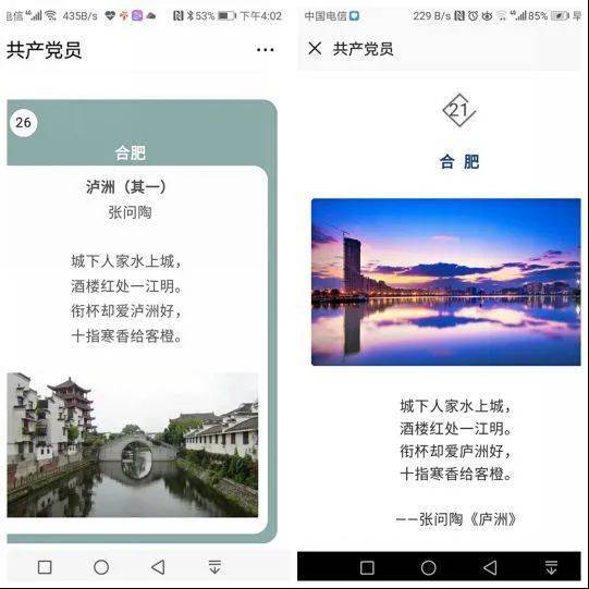 “共产党员”微信客户端推送的张问陶诗歌《泸洲》和《庐州》