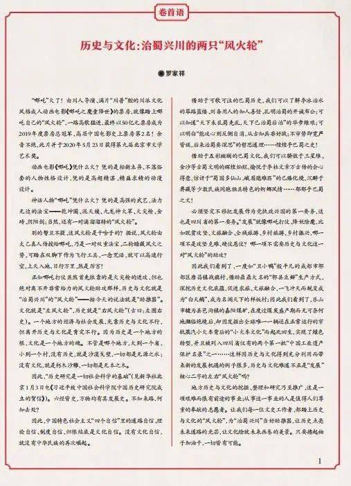 必须坚定不移把发展作为党执政兴国的第一要务,这也是四川省的第一要务“。发展”就像哪吒打仗、降妖除魔,比如脱贫攻坚、文旅融合、全域旅游、乡村振兴,哪一项不是攻 坚克难、硬仗恶仗?哪一项不需要历史与文化这一对“风火轮”的助攻?