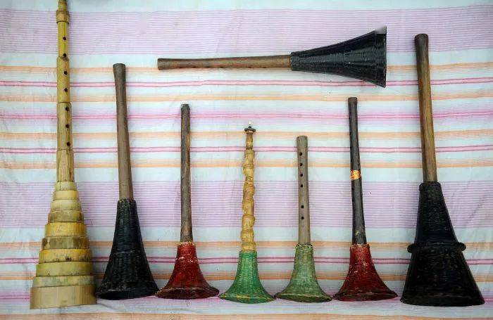 大竹竹唢呐,粗略一瞥,其形其状与传统铜制或木质唢呐没什么不同。但细究起来,你就会发现,它全身除了哨是燕麦杆外,其他部分全由竹乡土生土长而别处很难见到的罗汉竹制成。只有六孔五声音阶的大竹竹唢呐, 却可神奇地吹奏出高、中、低音。音色虽不及铜管唢呐清脆和嘹亮,但其略具沙哑而滞涩的声音却恰到好处地表现出大竹人与竹剪不断的情款款意绵绵的情愫。